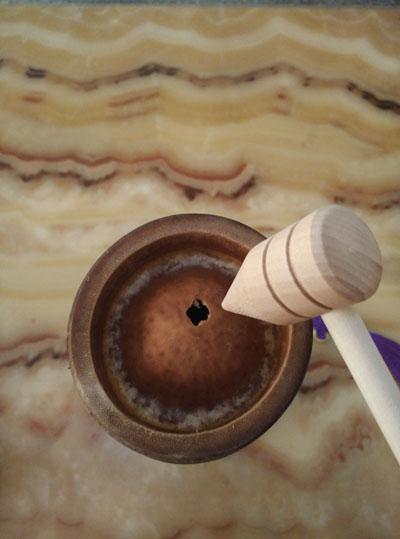 隨竹筒酒配送的木錘很精致,同樣在手柄處系有彩色的中國結吊墜,酒評君稱之為“開瓶器”。只需用開瓶器尖端部位,輕輕敲擊竹筒頂部即可“洞穿”。如下圖: