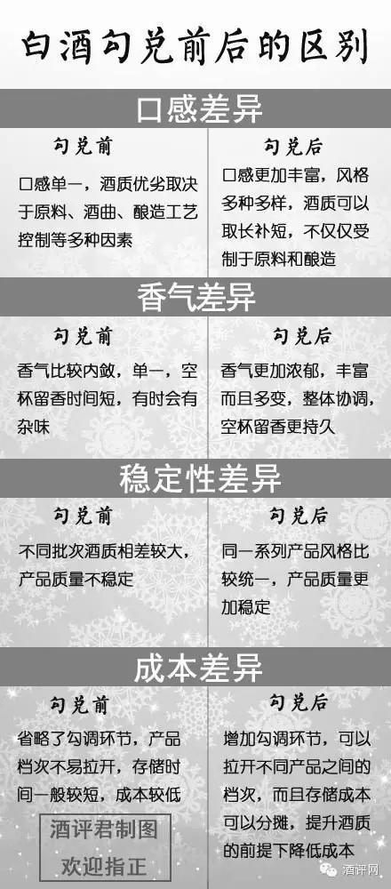 調(diào)酒是門藝術(shù),也是科學(xué) 除此之外,勾兌還起到了成本控制和產(chǎn)品等級(jí)劃分的作用。畢竟,白酒不單單是消費(fèi)者的精神寄托,還是酒廠賴以生存的產(chǎn)品,還得考慮盈利與市場(chǎng)競(jìng)爭(zhēng),不同等級(jí)的白酒用到的基礎(chǔ)酒和調(diào)味酒的風(fēng)格、質(zhì)量也不同,成本、價(jià)格自然也就各異。 早期的白酒勾調(diào)完全是憑著調(diào)酒師的天賦和經(jīng)驗(yàn),完成對(duì)產(chǎn)品品質(zhì)的標(biāo)準(zhǔn)化,香氣口感的提升以及成本的控制,隨著技術(shù)的發(fā)展和色譜儀等設(shè)備的出現(xiàn),白酒勾兌變得更加精確和可控,調(diào)酒師們可以更容易的調(diào)配出差異更細(xì)微、口感更多樣的白酒產(chǎn)品。 盡管如此,還是有不少消費(fèi)者更鐘情于原汁原味的原漿酒,于是就出現(xiàn)了文章開頭那樣的爭(zhēng)論,喝原漿酒是一種什么樣的體驗(yàn)?zāi)? 經(jīng)過老熟的好的原漿酒聞香一般會(huì)更加內(nèi)斂低調(diào),不像經(jīng)過勾調(diào)的白酒那樣酒香四溢;入口也會(huì)比較醇和,口中香氣雖然有時(shí)也會(huì)熱烈奔放,但變化比較單一,而且持續(xù)時(shí)間相對(duì)較短。如果把經(jīng)過勾調(diào)的白酒比作一個(gè)奔放多情的北方姑娘,而未經(jīng)勾調(diào)的原漿酒則像一個(gè)悶騷內(nèi)秀的南方女子(這個(gè)比方不太合適,酒友們不要罵我,哈哈),而且這個(gè)南方女子帶給你最大的驚喜在于,剛才還是連說帶笑,這會(huì)可能就是梨花帶雨——即使同一品牌未經(jīng)勾調(diào)的原漿酒,不同批次帶給你的感受也是不同。 市面上的原漿酒一般貯藏時(shí)間較短,畢竟大批量長(zhǎng)時(shí)間存放成本巨大,而小批量分批存放的意義又不是很大,因此除少數(shù)高端形象產(chǎn)品之外價(jià)格都不太高,一般在幾十至三百以內(nèi)。 最后酒評(píng)君(微信號(hào):jiuping_cn)總結(jié)一下,用一張圖讓大家了解白酒勾兌前后的區(qū)別: