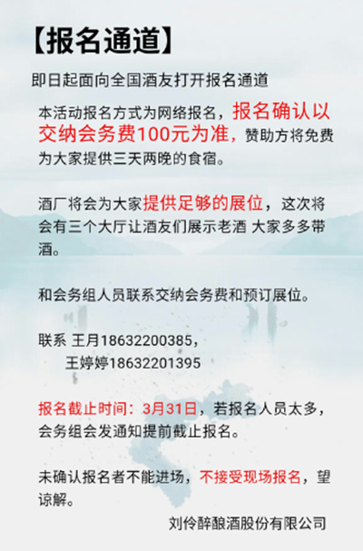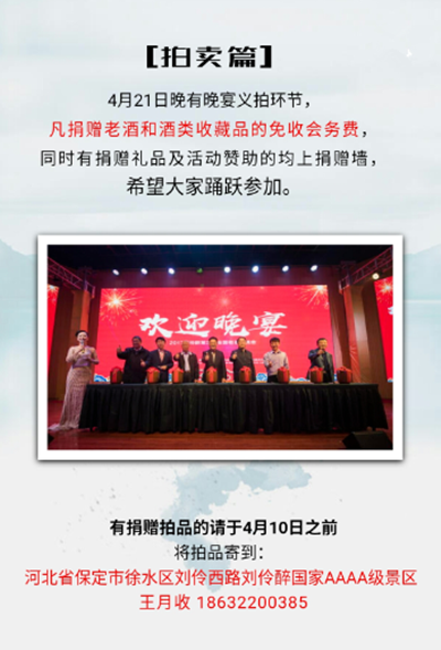 恰逢人間四月天,又遇周末好良辰; 三天兩晚免食宿,神秘大禮竟向迎; 名流大咖齊相聚,千人酒友互交流; 本是4A名勝地,又接雄安新佳景; 劉伶醉酒傳千古,饕餮盛宴待賓朋。 老酒交流會啟動,誠摯邀請候佳音。 ——《劉伶醉第四屆全國老酒交流會》題記 人間四月天。四月美在花開,四月又美在花落,正如白居易名詩描述的那樣“人間四月芳菲盡,山寺桃花始盛開”。有人說,時間是無限的,猶如長江之水永遠奔騰洶涌源源不斷,然而每個人能享受的時間卻是有限的,所以時間又是最寶貴的。在艷陽的四月天,給你三天時間,你會干什么?是同家人旅游,還是約上好友對酌山花開,亦或與同道中人促膝長談?若有一場盛會,以上種種一一夢想成真,你會欣然前往嗎? 4月21—23日,冀酒龍頭企業劉伶醉將舉辦為期三天的第四屆全國老酒交流會,對于酒友,尤其是愛好老酒的酒友應該是不可錯過的盛會。試想一下,在人間的四月天,在鮮花和美酒的陪伴下,給你三天時間,又恰逢是周末,并且免費提供三天兩晚食宿,此外還有神秘大禮相送,你會拒絕嗎? 劉伶醉已經成功舉辦了三屆全國老酒交流會,受到了業內外的普遍關注,而同期推出的紀念酒也贏得了消費者的廣泛贊譽。例如第一屆交流會推出的劉伶醉萬壇酒林和大酒海,第二屆推出的劉伶醉酒簍以及第三屆推出的封壇大典紀念酒等。在本屆交流會期間,劉伶醉也將推出紀念酒——劉伶醉開壇酒。 劉伶醉是一個有社會責任擔當的企業,在4月21日的晚宴環節將舉行義拍活動,所得善款將全部捐于慈善機構。與會人員可以捐贈自己的老酒和酒類收藏品為義拍和慈善事業出一份力。劉伶醉為捐贈禮品者以及活動贊助者提供上捐贈墻服務以期答謝。有捐贈拍品的請于4月10日之前將拍品寄到劉伶醉酒廠,具體地址和聯系人參見下圖: 此外,劉伶醉還提供了足夠的展位,共計三個大廳讓酒友們展示老酒,并有多位行業大咖現場進行交流和互動。正所謂遇高人豈可交臂失之,這對于重新認識老酒以及中國酒文化裨益良多。酒友們,你心動嗎? 當然,除了參加活動,酒友們還可以歡快的暢游一番。劉伶醉酒廠本身就是國家AAAA級景區。景區內風景宜人,不但有金元時期的古燒鍋遺址,還有堪稱“中國第一酒林”的萬壇酒林等等。 另外,劉伶醉酒廠位于雄安新區內。參加活動之余,酒友們還可以趁此機會游覽雄安新區。畢竟在“五一黃金周”到來之際,在景區人滿為患之前,酒友們有如此良辰美景在前,錯過難道不可惜! 既可參加老酒交流會,又可暢游雄安新區,何樂為不為?總之一句話,劉伶醉在四月艷陽天,已經備好了美酒,只等酒友們踴躍到來,約嗎? 注:本活動報名方式為網絡報名,報名確認以交納會務費100元為準,免費提供三天兩晚食宿,報名截止時間為3月31日,不接受現場報名。報名具體方式如圖: 劉伶醉第四屆全國老酒交流會: 主辦方:中國收藏家協會 協辦方:老酒圈、曾品堂、河北省酒類收藏協會 承辦方:保定市酒類收藏協會、京津冀酒版文化協會、保定市劉伶文化研究會 總贊助方:劉伶醉釀酒股份有限公司、北京巨力國際拍賣有限公司 |