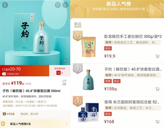 伴隨著晚宴的進行,中韓嘉賓們紛紛舉杯暢飲,將晚宴氣氛一次次推向高潮。參與晚宴的韓國嘉賓紛紛表示,天青色的子約Ⅴ暢飲版讓人一見傾心,40.8°暢飲版的酒體不負其名,醉得慢、醒得快、輕松暢飲。 創新為本聯合有品老牌翻紅,子約喜提人氣榜酒類冠軍 10月19日,孔府家酒子約Ⅴ暢飲版如約上線小米有品預售。據悉,本次上線子約Ⅴ暢飲版是子約第五代產品,亦是2019年的收官之作,子約Ⅴ暢飲版顏色選用“天青色”,酒體選擇超百次調配40.8°的“黃金酒體”。子約Ⅴ暢飲版定價159元,在預售期間(預售截止時間為10月31日)采用訂金膨脹的方式回饋有品用戶,上線當天預售火爆,助推子約力壓舍得米蘭國際時裝周紀念版,喜提新品人氣榜酒類冠軍。