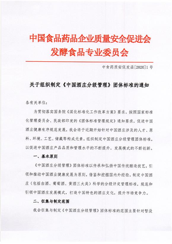 近年來中國酒業保持著良好發展態勢,中國酒莊發展模式,已得到社會的廣泛認同。中國酒莊作為中國酒文化與價值的新表達,呈現出傳統釀造工藝的獨特魅力。為助力推動中國酒業健康發展,傳承和弘揚中國傳統釀造工藝,積極探索在新消費時代,不斷滿足民眾對酒業新形態中國酒莊模式發展的需求認同,近日,中國食品藥品企業質量安全促進會發酵食品專業委員會印發“關于組織制定《中國酒莊分級管理》團體標準的通知”(中食藥質安促函[2020]1號)。專家認為:這對于推動中國酒業發展,是一件值得助力關注的大事。 出品/中國酒莊團隊 中國酒莊企業在消費主權時代探索特色的“小而美”中國酒莊發展模式,為美好生活開啟了另一種全新方式。據了解,編制《中國酒莊分級管理》團體標準將充分考慮中國國情特色,制定科學適用的中國酒莊分級管理標準。標準分級涉及范圍主要是傳統釀造工藝酒種(白酒、黃酒、葡萄酒)三大類酒莊企業,眾多中國酒行業資深專家將參與標準編制審定工作。 《中國酒莊分級管理》團體標準以傳承和弘揚中國傳統釀造技藝,引領和推動中國酒業健康發展為原則,借鑒和挖掘國內外經驗,制定中國酒莊(包括白酒、葡萄酒、黃酒三大類)科學的分級管理標準,規范和引領中國酒莊發展模式,打造中國特色的酒莊文化,提升市場竟爭力。 《中國酒莊分級管理》團體標準由中國食品藥品企業質量安全促進會作為團體發布,成都上善時代文化傳播有限公司作為牽頭編制單位,中國沈酒集團有限公司、四川省謙河商貿有限公司源窩子酒莊等眾多單位和專家將參與起草,針對中國酒莊涉及的人才、原料、環境、工藝、儲藏等構成元素,組織制定《中國酒莊分級管理》團體標準,以促進中國酒莊產品品質和管理水平的不斷提升,發展模式的不斷創新。 《中國酒莊分級管理》團體標準主發起人、資深品牌傳播專家葉歌認為,針對國內暫沒有國家標準、行業標準和地方標準的中國酒莊空白領域,以便快速適應新消費時代對中國酒莊發展模式的緊迫要求,以及酒莊企業在技術創新、管理創新、營銷創新的需求,《中國酒莊分級管理》團體標準編制實施,將指導中國酒莊企業規范化、特色化、標準化有序發展,團體標準將助力中國酒莊企業這一極具潛力群體得到較好發展,也為推動中國酒業的整體發展、地方經濟產業融合創新路徑發揮積極作用。 對《中國酒莊分級管理》團體標準的制定與實施,中國酒業資深專家賴高淮、曾祖訓、季克良、胡永松、梁邦昌、賴登燡、徐占成、鐘杰、段長青、傅建偉、邱樹毅、周心明、張文學、沈毅、李東、嚴志勇、張金修、席玉、周勁松、楊官榮、龍則河等老師們,給予了高度贊許和充分肯定,一致認為這是中國酒業發展的一件大事,中國酒莊群體必然在未來得到更好的發展。