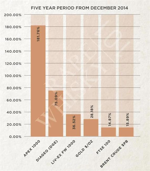 既然單桶已為威士忌進行了如此加持,那存桶的意義又是什么呢。 這個自然讓我們聯想到了投資市場里大家非常熟悉的期貨,投資的都是一種未來價值,在未來的行情發展過程中,與即時交收的商品相比,更多了投資期限所帶來的增長期待。 當然,期酒與金融市場的期貨“先報志愿再考試”的風險有較大的差異,如已非常成熟的波爾多期酒市場,酒類價值在投放市場前的“模擬考”對“考生”的評估基本評分已塵埃落定,那最終投資回報價值基本只跟市場容量和追捧程度相關了。而且這種期酒沒有杠桿,加上運營方通過饑餓營銷進行銷量控制,下降風險已被控制,那考驗的主要是眼光和市場研判,最后決出勝負的主要就是看升值的高低了。 而威士忌單桶存桶,存放過程的價值提升更類似于,大家對這個行業的認可,對市場增幅的期待上,以下圖表一目了然地呈現了威士忌APEX1000標準指數近年所呈現的整體漲幅,平均每年升幅23.46%,已普遍高于葡萄酒指數、黃金、原油等指數。可見行業目前對此的追捧還在一個持續增長的周期。