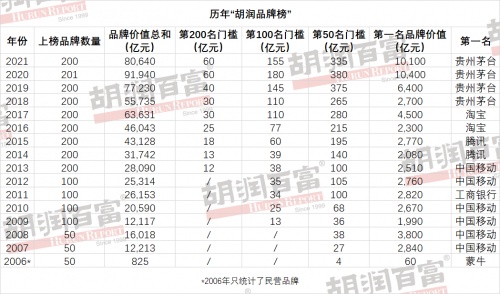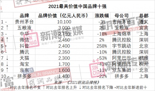 貴州茅臺連續第四次成為胡潤“最具價值中國品牌”,為唯一一個萬億級品牌 五糧液品牌價值3,000億元,超過天貓和淘寶,排名上升三位至第二 微信品牌價值上漲2%至2,450億元,排名上升三位至第四 抖音品牌價值上漲至去年的3.5倍,是價值漲幅第二大的品牌,以2,400億元位列第五,是唯一一個新進前十的品牌。 小鵬汽車是價值漲幅最大品牌,增長至去年的近4倍,達到290億元 7個品牌價值增長超一倍,包括長城汽車、蔚來、比亞迪、李寧和石頭 美團和中國平安跌出十強,品牌價值都下降四成左右,以1,350億元并列第11 以蔚來為首的汽車行業價值增長最快,平均漲幅121%;其次是以抖音為首的娛樂行業和以海天為首的食品飲料行業,平均漲幅分別為19%和13% 34個新上榜品牌,來自食品飲料行業的最多,有10個。新上榜品牌依次是科沃斯、周大福、李錦記、康師傅、舍得、福臨門、Boss直聘、中金公司、衛龍、貨拉拉、興盛優選、銳澳、旺旺、滔搏運動、老干媽、謙尋、知乎、劍南春、波司登、元氣森林、EMS、珀萊雅、美ONE、歐派、六個核桃、51job、迎駕、口子窖、喜茶、YY直播、哈啰出行、潔柔、金六福、悅刻 新東方、學而思等6個教育品牌落榜,恒大、金地等4個房地產品牌落榜,金融行業也有國信證券、光大證券等4個品牌落榜 61%,即122個是民營品牌,比去年多4個,五年前民營品牌占比49%,十年前42%。60個民營品牌進入全國百強,比去年多2個。7個民營品牌進入全國十強,比去年少1個。34個新上榜品牌中,31個是民營品牌 總價值8.1萬億,雖然比去年下降12%,但仍然是五年前的2倍、十年前的3倍 上榜品牌最多的三大城市依然是北京、上海和深圳,分別有60個、32個和18個,占整張榜單近六成 胡潤研究院今日發布《2021胡潤品牌榜》,200強最具價值中國品牌上榜。這是胡潤研究院連續第十六年發布胡潤品牌榜。 200強品牌來自中國46個城市。91個品牌的價值較去年增長或保持不變,包括34個新上榜,48個增長,9個不變。109個品牌價值較去年下降。金融、酒類和食品飲料行業是上榜品牌數量最多的前三大行業,占整張榜單近四成。非國有品牌占六成,國有品牌占四成。200強上榜門檻為60億元,與去年持平。百強上榜門檻為155億元,比去年降低25億元。 胡潤百富董事長兼首席調研官胡潤表示:“從我們品牌榜的變化可以看出中國的消費趨勢,希望這份榜單能夠幫助到針對消費者的品牌。很高興與中國社區第一媒體流量平臺新潮傳媒聯合發布今年的胡潤品牌榜。” “今年品牌榜上,汽車行業的品牌價值平均漲幅最大,其次是娛樂、食品飲料行業,房地產行業的品牌價值平均跌幅最大,其次是電子商務和零售,以及生活服務行業。” “從我們品牌榜能看出今年運動服裝品牌的增長,如安踏、李寧,‘健康中國2030’以及2022北京冬奧會帶動了人們運動的積極性,觸發了運動服裝的消費。” “民營品牌占比這十年漲了近50%。今年61%的上榜品牌是民營品牌,十年前42%。” “這是我們連續第十六年發布胡潤品牌榜,通過我們品牌榜能看出中國消費者生活的變化。從品牌價值能看出中國針對消費者的品牌市場成熟了很多,前100名的門檻是十年前的5倍。” “胡潤品牌榜今年第一次涵蓋港澳臺資品牌,一共有4個上榜:周大福、李錦記、康師傅和旺旺。” “阿里巴巴、字節跳動雖然品牌很出名,但因為不是面向消費者的品牌,因此不在我們品牌榜的調研范圍內,而它們旗下面向消費者的品牌如天貓、抖音,則在我們榜單上。”胡潤補充。 五年、十年前的十強 十年前,前十名門檻為640億,當時的前十名中,還有騰訊、貴州茅臺兩個品牌今年還在前十。五年前,前十名門檻翻倍到1,200億,當時的前十名中,還有淘寶、騰訊、微信、天貓四個品牌今年還在前十。今年,前十名門檻上升至1,400億,是十年前的2倍多。 新上榜品牌 34個新上榜品牌,來自食品飲料行業的最多,有10個。企業總部在北京和上海的最多,分別有7個。胡潤品牌榜今年第一次涵蓋港澳臺資品牌,一共有4個上榜,以周大福和李錦記為首。 地域分布 全國200強總部在北京的最多,有60個,比去年少7個,總部在北京的前三大最具價值品牌是抖音、京東和美團;廣東第二,有40個,比去年少1個,總部在廣東的前三大最具價值品牌是微信、騰訊和中國平安;上海第三,有32個,比去年少1個,總部在上海的前三大最具價值品牌是中華、拼多多和蔚來。浙江第四,有15個,和去年一樣;江蘇第五,有9個,比去年少1個。 金融行業 中國平安和工商銀行蟬聯最具價值金融品牌前兩名,中國平安品牌價值比去年下降34%至1,350億元,工商銀行品牌價值比去年下降26%至1,300億元;招商銀行從第五上升至第三,品牌價值比去年上漲9%至1,200億元。38個上榜金融品牌中有12個是民營品牌。上榜金融品牌的品牌價值總和占整張榜單16%。總部在北京的最多,有14個。 酒類行業 酒類行業前三名仍然是貴州茅臺、五糧液、國窖1573。汾酒從第五上升至第四,品牌價值比去年上漲90%至665億元。共有20個酒類品牌上榜,其中有6個民營品牌。上榜酒類品牌的品牌價值總和占整張榜單21%。 食品飲料行業 海天蟬聯最具價值食品飲料業品牌,但品牌價值比去年下降13%至1,050億元;農夫山泉保持第二,品牌價值比去年上漲11%至785億元;伊利從第四升至第三,但品牌價值比去年下降20%至325億元。食品飲料行業共有19個品牌上榜,其中14個為民營