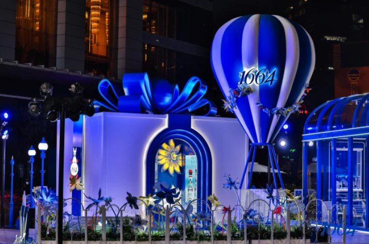 迪麗熱巴在藝境酒吧,制作1664x廟前冰室節(jié)日版限定雞尾酒 透過藝境酒吧的落地玻璃望出去,明亮街燈、棉花糖車、埃菲爾鐵塔與熱氣球,抽離了時間與空間的局限,讓人恍惚間猶如置身法國街頭,在一片片繁花光影中愜意游走。Micha?l創(chuàng)作的百香果花、柑橘花等繁茂花朵,猶如飄舞的絲帶,攀附在埃菲爾鐵塔之上,為這座標志性的法式建筑再添靈動詩意。登上以花卉裝點的藍白熱氣球,遙望埃菲爾鐵塔,沉浸式體驗法式輕盈與浪漫,為新的一年放飛美好期盼。